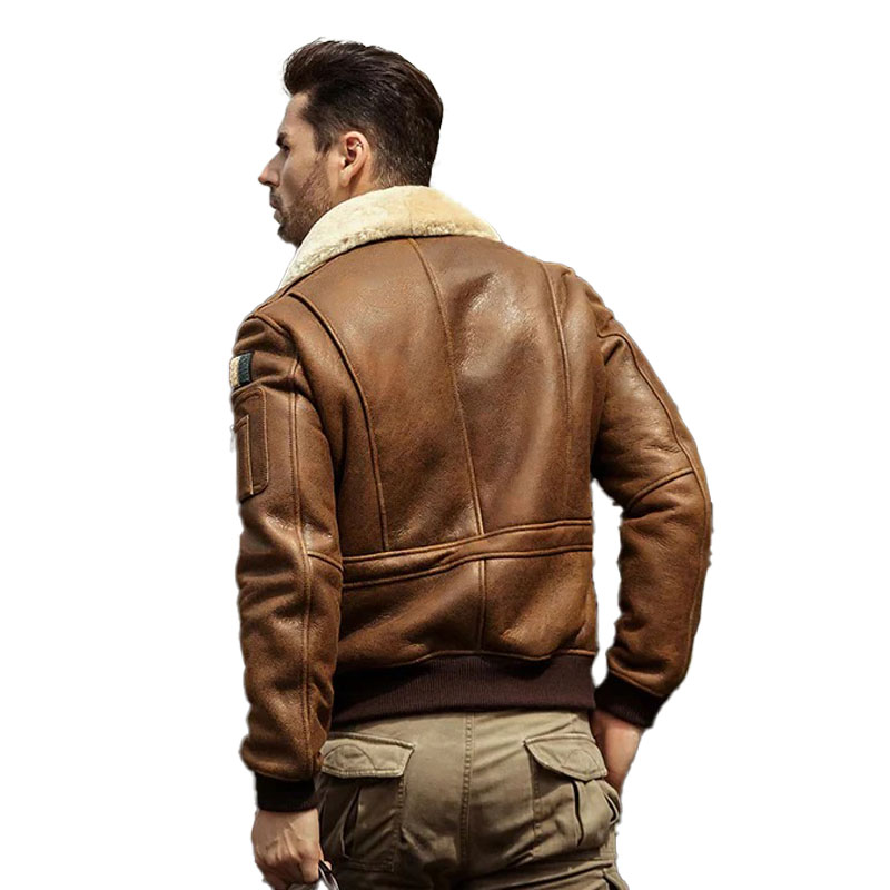 Brown Embroidered Shearling Leather Bomber Jacket