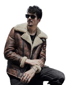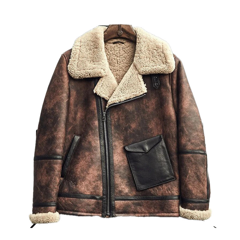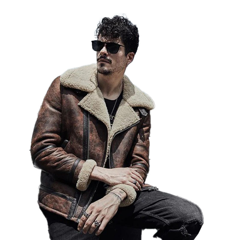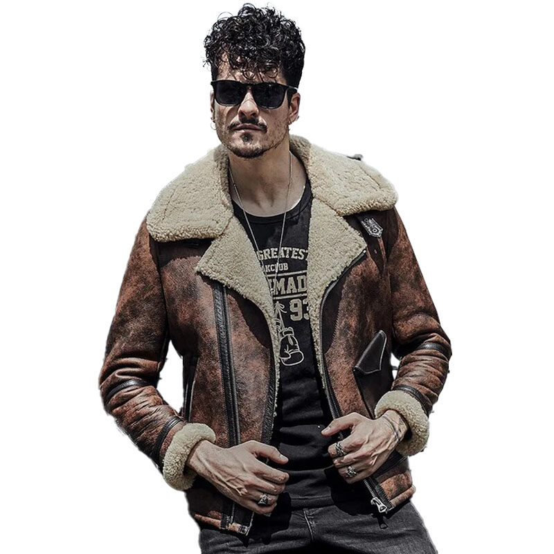 Mens Waxed Brown Leather Shearling Jacket Coat
