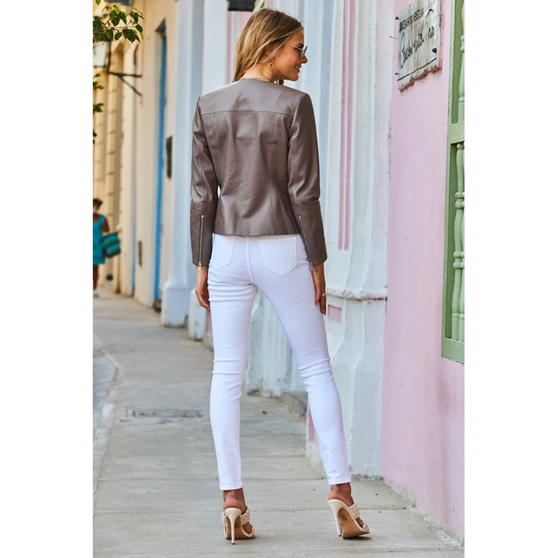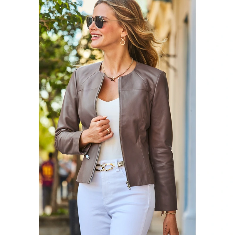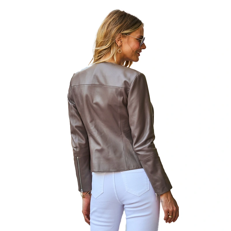 Taupe Zip Front Round Neck Leather Jacket